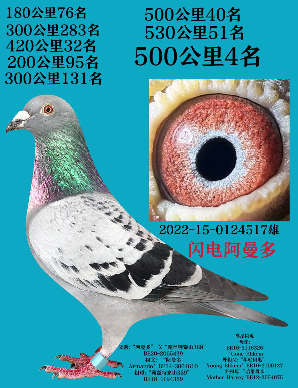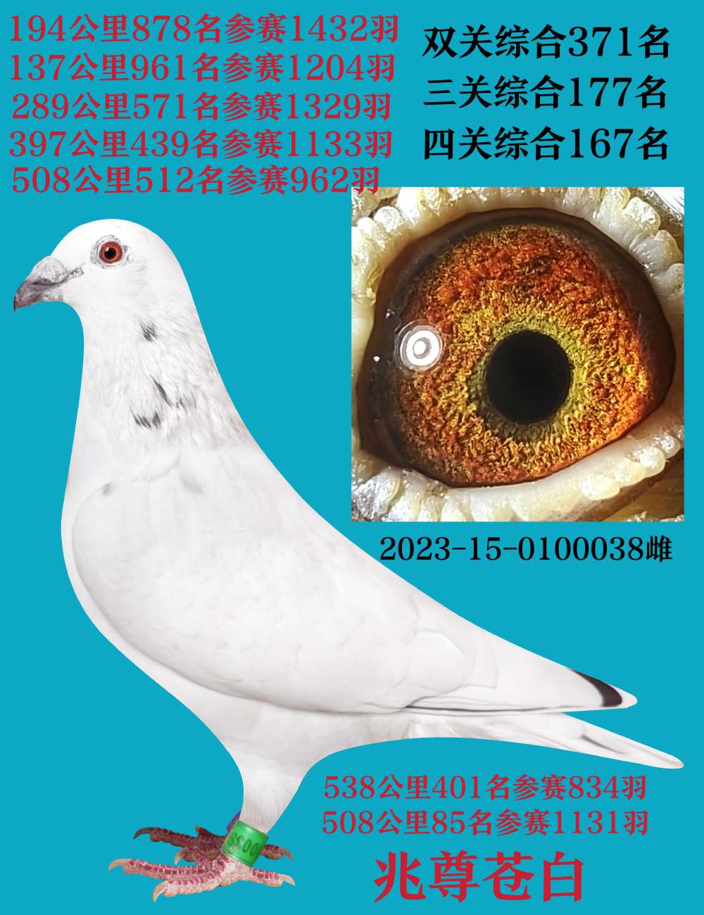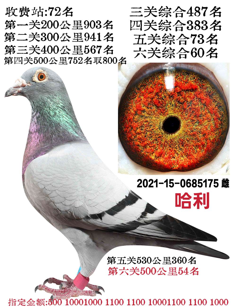 2022-16-1106112山东翔宇公棚参赛费:2999元) 鸽主仙人指路-杨永敢 此鸽中等体型 质量各方面包满意 母鸽子 后面图片是父母 父亲河北赛鸽强豪耐速系 母亲江苏赛鸽强豪鑫克隆陈华 160公里438名1077分速参赛11684羽330公里4685名978分速参赛11304羽460公里7251名参赛8761羽530公里决赛1611名参赛4703羽557公里精英赛一关90名1115分速参赛1525羽557公里二关1249名787分速参赛1859羽330公里指定1800元430公里指定500元加站赛一关指定1500元获奖3840元第二次加站赛指定4700元海南新疆不发货商家:商丘串串鸽业19562970063出价: ¥ 310.00/0次剩余时间:2天4小时59分 -