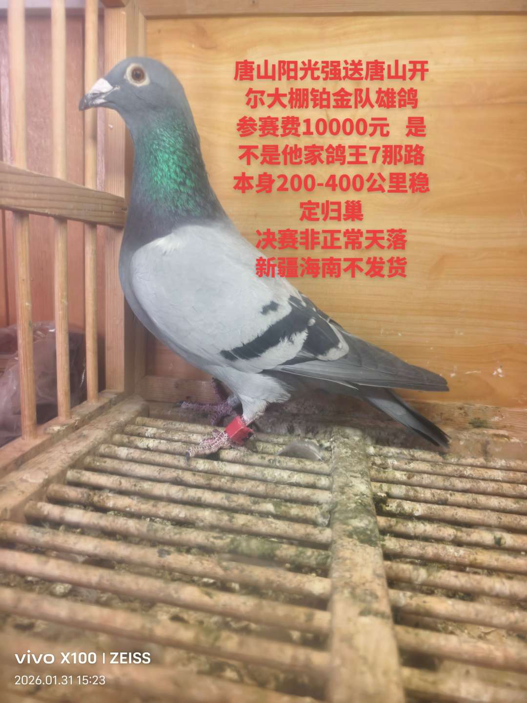 唐山阳光强送唐山开尔大棚铂金队雄鸽 参赛费10000元 是不是他家鸽王7那路 本身200-400公里稳定归巢 决赛非正常天落商家:风顺13383175454出价: ¥ 100.00/0次剩余时间:1天15小时37分 -