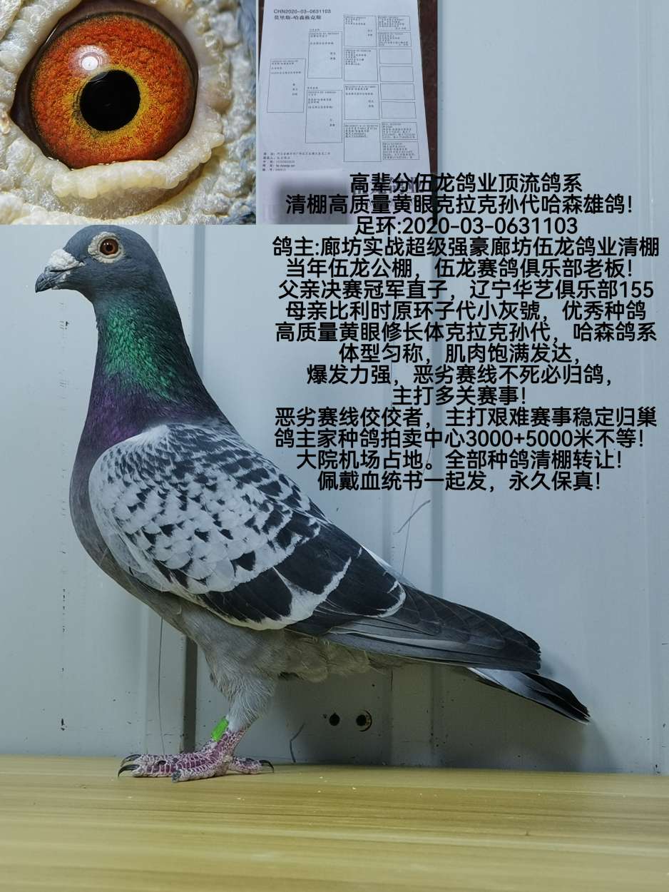 高辈分伍龙鸽业顶流鸽系清棚高质量黄眼克拉克孙代哈森雄鸽!金牌价格:1000元 运费:0元