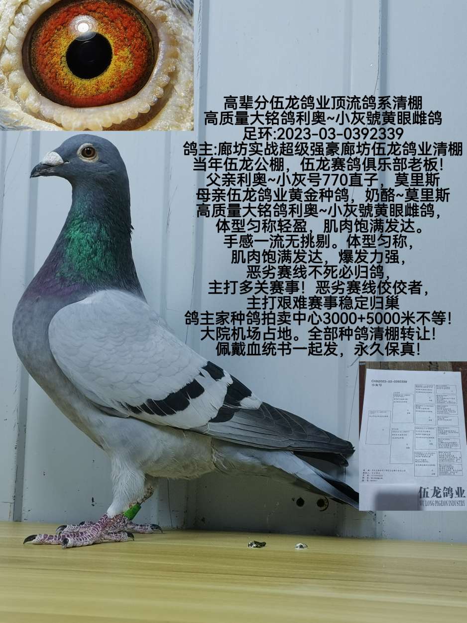 高辈分伍龙鸽业顶流鸽系清棚高质量大铭鸽利奥~小灰號黄眼雌鸽!价格:1000元 运费:0元 -