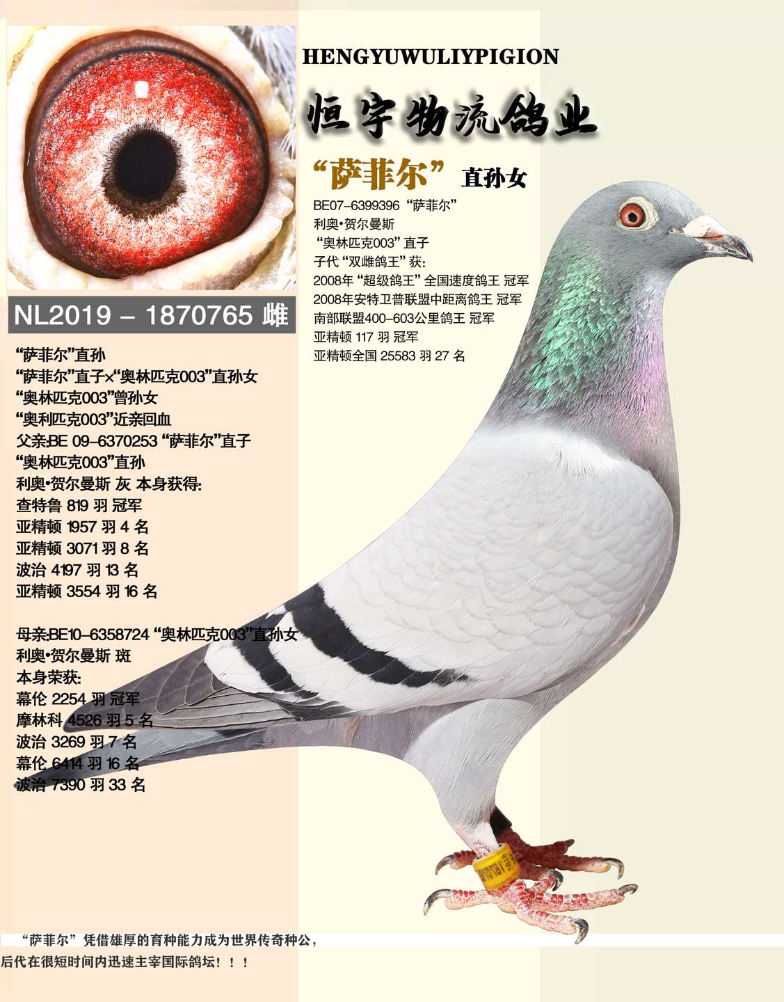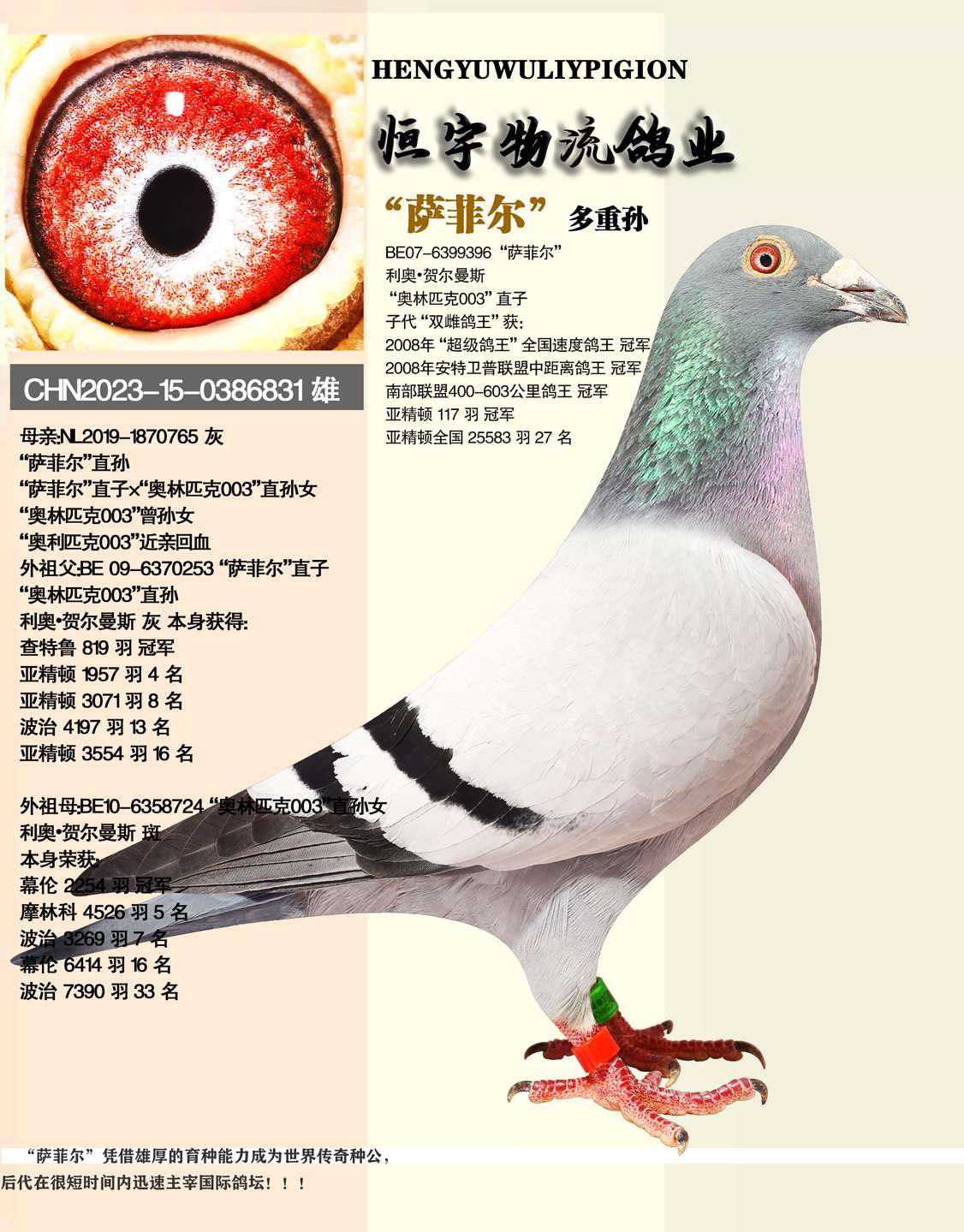 信鸽鸽子“萨菲尔”多重近亲,利奥优秀代表鸽,实战公棚家族,获得优秀成绩鸽多羽,多项指定赢得8位数奖金。