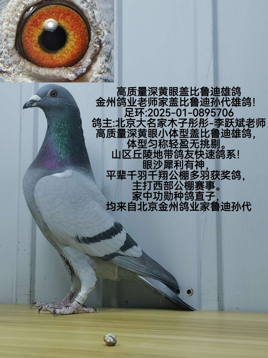 高质量深黄眼小体型盖比鲁迪雄鸽,体型匀称轻盈无挑剔。山区丘陵地带鸽友快速鸽系!眼沙犀利有神,平辈千羽千翔公棚多羽获奖鸽,主打西部公棚赛事。家中功勋种鸽直子,均来自北京金州鸽业家鲁迪孙代