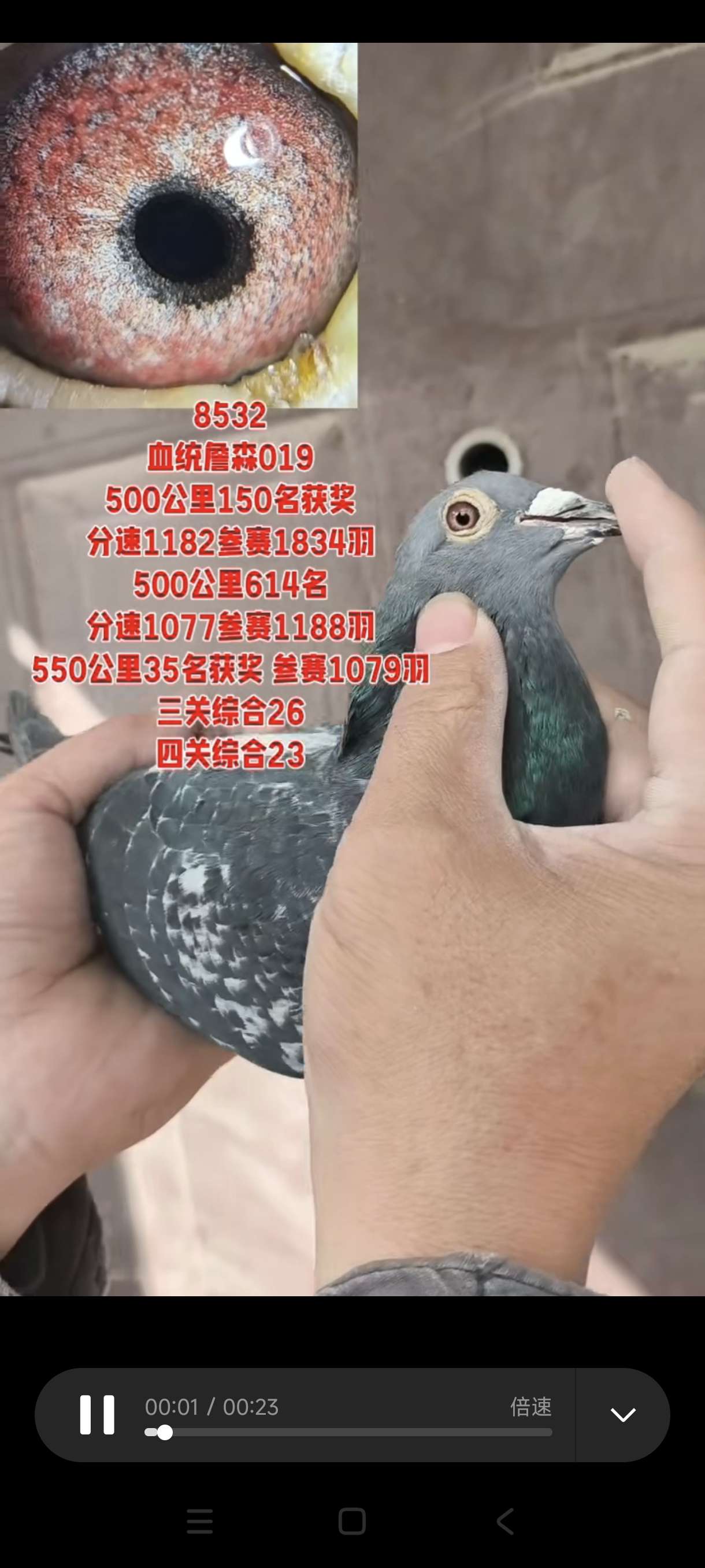 血统:詹森019,沙眼参考雌鸽,所有赛事全部飞完,500公里单关获奖鸽,几关综合获奖鸽,上手轻飘,个体高级,家族发挥出色