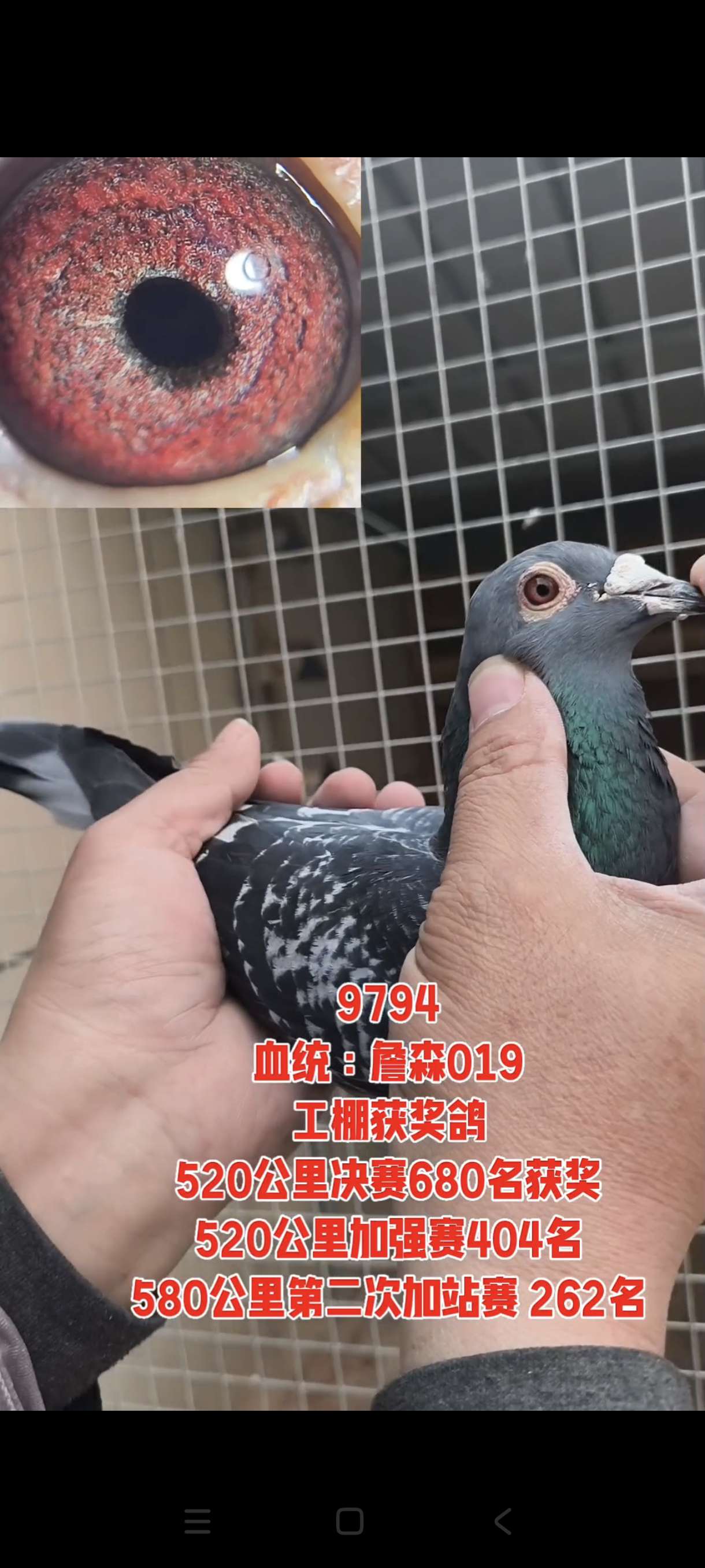 血统:詹森019,沙眼参考雌鸽,安庆华送山东潍坊玉鑫赛鸽工棚成绩鸽,参赛费1300元,中大鼻瘤带育种瘤。羽条破风较好,肌肉饱满一字尾下压,个体高级