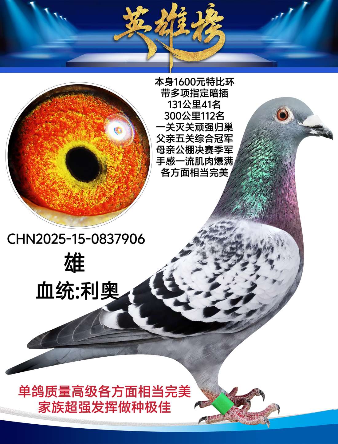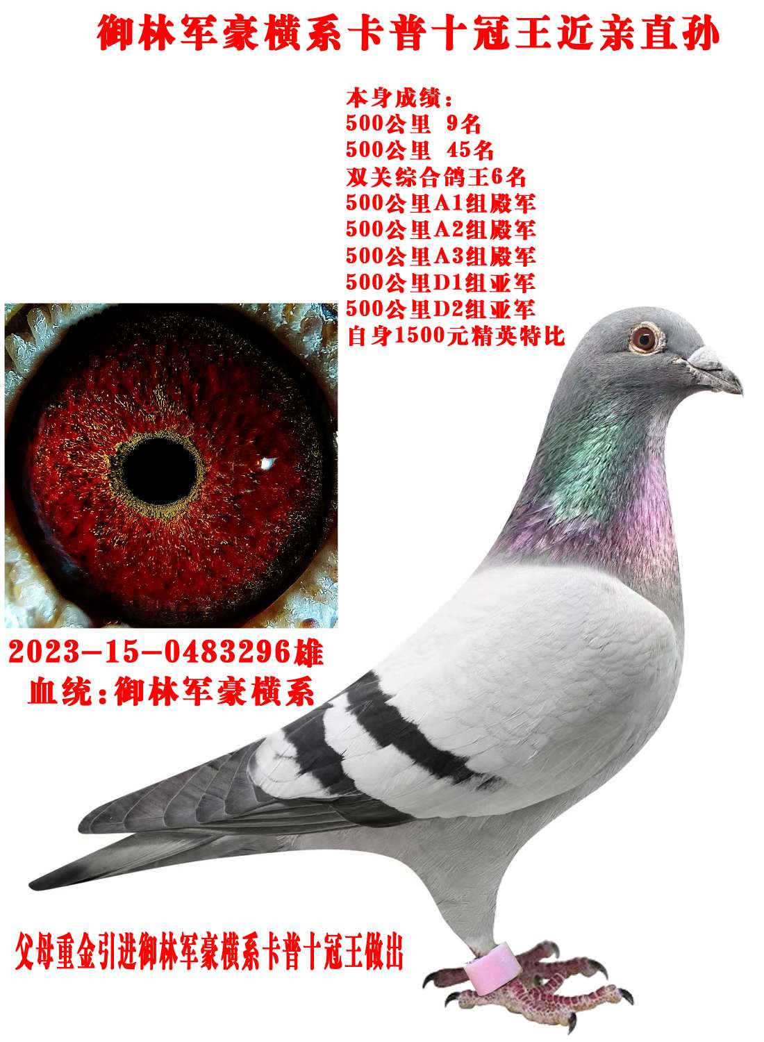 御林军豪横系实战种公 本身斩获双关综合鸽王6名 多项指定高位获奖,喜欢的把握 商家:盛世启航-吴岩辉出价: ¥ 300.00/0次剩余时间:3天8小时32分 -