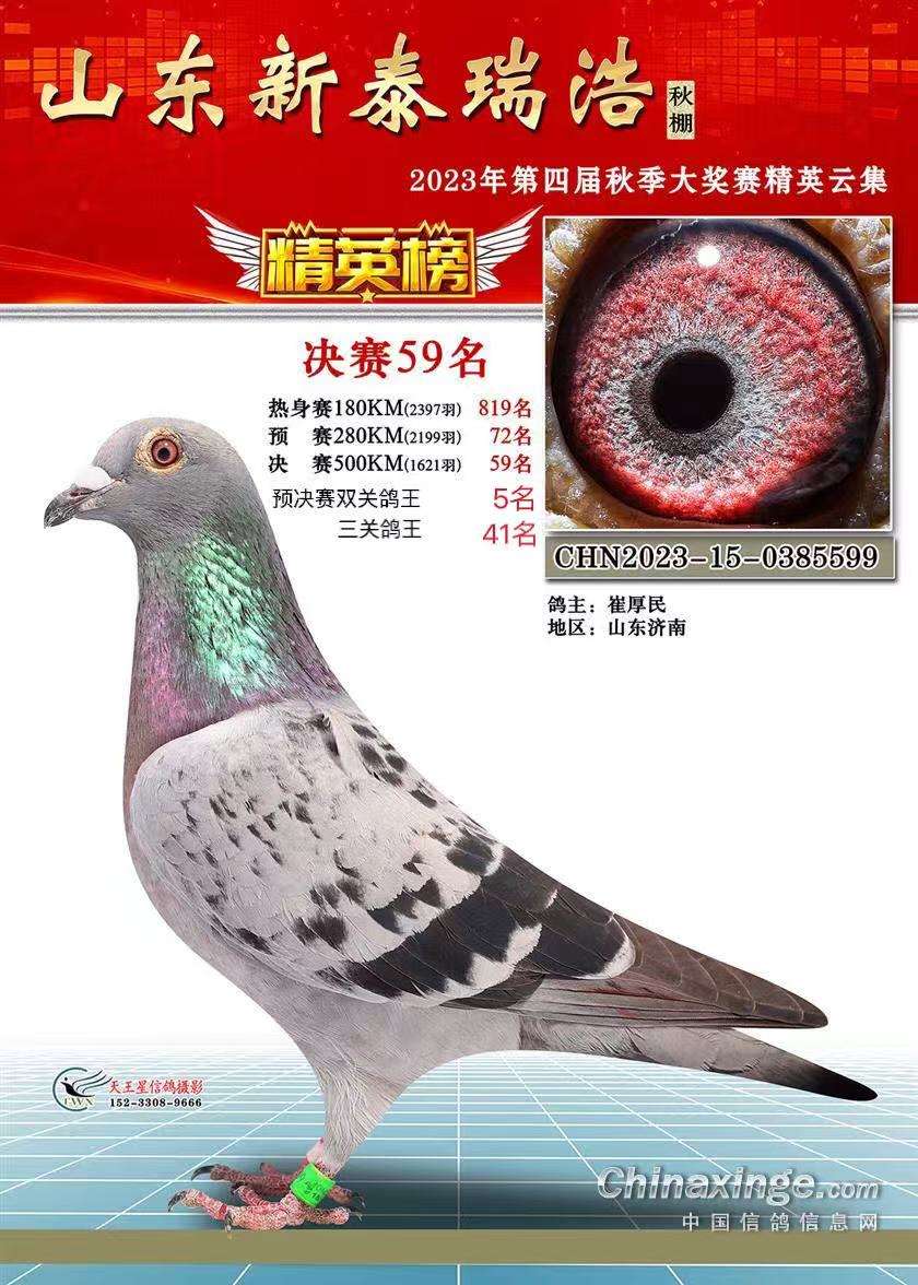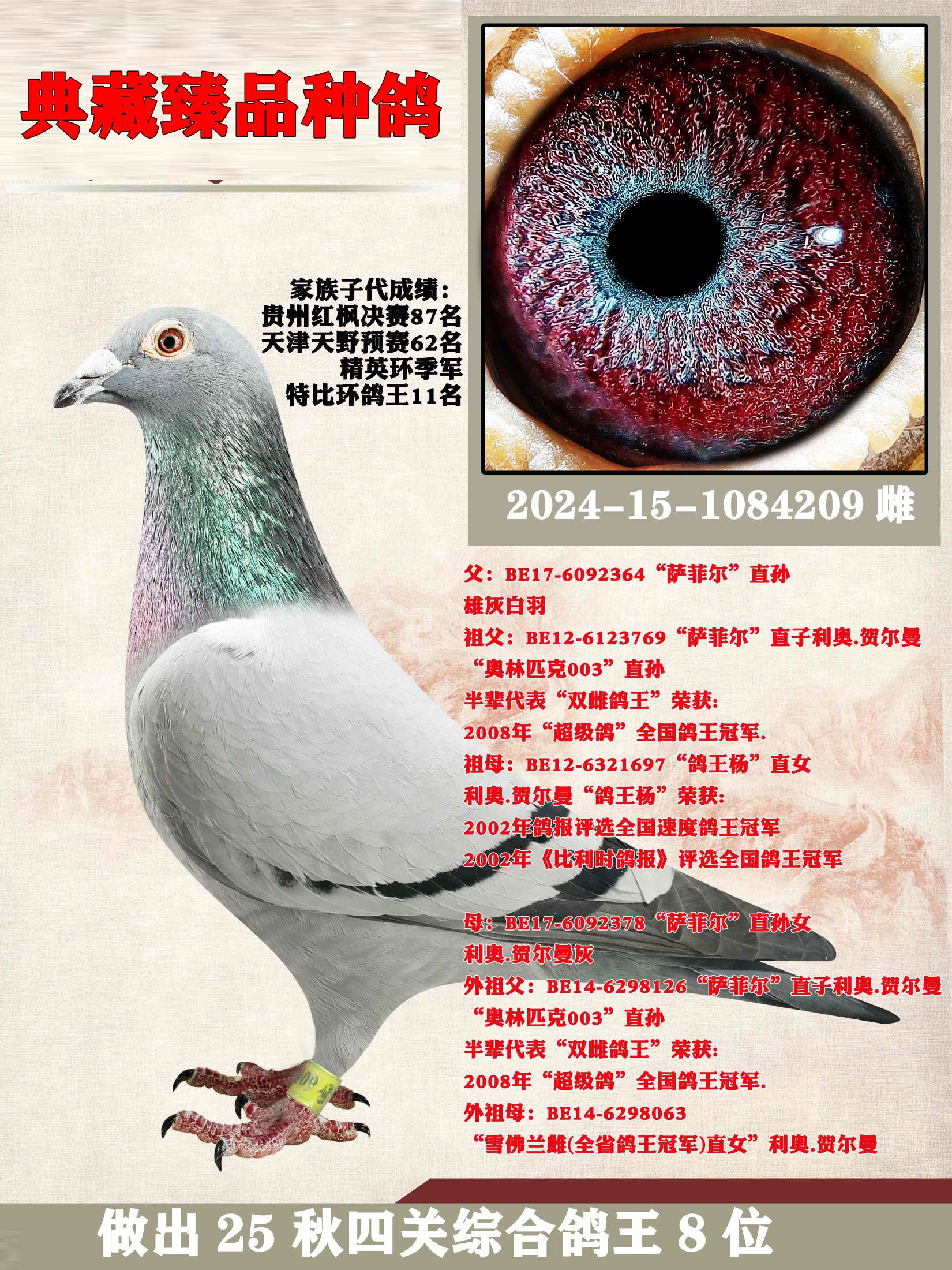 2025-10-0382517江苏银石寄养棚参赛鸽 3000元特比环 不算寄养费 参赛名张钧 鸽主是本地赛鸽名家淼鑫鸿运聂海峰 鸽主每年高价引进种鸽 多个寄养棚团长 此鸽是银石寄养棚鸽王8名的全平辈 血统克拉克配飞戈 自身炮弹体型前胸宽 质量高级 母鸽子 137公里1002名1255分速参赛4477羽136公里572名1139分速参赛4412羽200公里898名1233分速参赛4336羽247公里1620名1172分速参赛3985羽496公里一关1179名08分速参赛3598羽二关迟归 鸽主拿回海南新疆不发货商家:商丘串串鸽业19562970063出价: ¥ 20.00/1次剩余时间:4天6小时18分 -